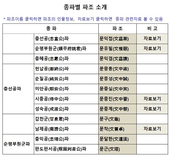 남평문씨 파(派) 분류 한 그루의 나무가 자라면서 여러개의 가지로 나뉘어 번성하듯이, 하나의 성씨도 나무처럼 그 근원에서 갈라져 나온 가지가 있는데 이를 파(派)라고 합니다.남평문씨는 10개의 큰 파로 나누어져 있고, 각 파는 다시 작은 파(지파)로 나누어져 있습니다. 파 이름은 호나 벼슬 및 세거지 등으로 표시하고 선조님의 이름을 사용하기도 합니다. 문씨의 훌륭한 점 중 하나는 여러 그루의 나무가 모여 이룩한 숲이 아니고, 본관이 남평(南平)이라는 뿌리를 갖인 단 한 그루의 나무가 번성한 것임으로, 모든 문씨는 친척이며 일가라는 점입니다. 남평문씨를 만났을 때 파(派)를 따져보면 멀고 가까움을 알 수 있으며, 세손(世孫)을 따지면 위, 아래를 알 수 있습니다. 남평문씨 10개 종파의 파 분류는 아래와 같습니다(파란색 이름이 각파의 파조임). ![]() * 10개 종파 분류 이외에, 종파를 크게 분류할 경우 10세 휘 익점 선조 후손들 5개파를 충선공파(전에는 강성군파라 했음), 4세 휘 유필 선조 후손들 2개파를 순평부원군파라고 합니다. * 본인이 속한 파와 세를 알아보려면 남평문씨 홈페이지 "인터넷대동보"의 "족보검색"에서 "본인 이름"과 "아버지 이름" 입력하여 검색하면 알 수 있습니다.