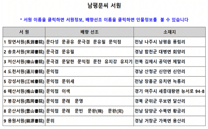 서원은 큰 인물의 제사와 양반자녀의 사립 교육기관을 겸하였기에 세금이 면제되고 원생에 대해서도 역(役;병역)이 면제되었습니다. 서원의 건물배치는 신실(신위를 모신곳)이 맨 위에 자리하고 신실 앞에 강당이 있으며 강당 앞의 왼쪽이 동제(고등반의 거실) 서제(초등반의 거실)로 구성됩니다. 서원에 모신 분들 중에서 가장 큰 어른을 주벽이라고 하는데 전국서원의 주벽은 충선공 諱익점公과 고려의 최영장군님이 가장 많습니다.