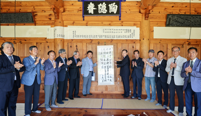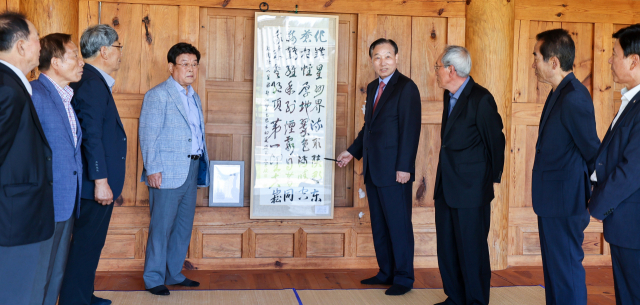 매일신문 2025-06-24 서예로 되살린 유학의 정신…단순한 필묵 넘어 선비정신 담은 예술 ![]() 문재환 전 성주부군수(작품 오른쪽 맨 앞)가 도은 이숭인 선생의 시 '가야산에 올라' 행초서 작품을 이시웅 청휘당 당장에게 전달하고 있다. 이영욱 기자 경북 성주군의 깊은 역사와 정신을 품은 청휘당 도은재에 23일 한 점의 서예작품이 걸렸다. 문재환 전 성주부군수가 고려 말 대표적 유학자 도은(陶隱) 이숭인(李崇仁) 선생의 시 '가야산에 올라(登伽琊山)'를 행초서로 정성껏 써서 성주 이씨 밀직공파 후손들에게 기증한 것이다. 이번 기증은 성주 이씨 화수회의 요청으로 성사됐으며, 작품은 도은 선생의 추모 재실 대청에 걸려 누구나 자유롭게 감상할 수 있도록 공개됐다. 한 점의 서예가 공간을 압도하고, 그 정신이 세대를 관통하는 순간이었다. '가야산에 올라'는 도은 선생이 권문세족의 부패를 비판하고 친명(親明) 외교를 주장하다 유배되어 성주에 머물던 시기, 가야산 자락에서 쓴 시다. 내면의 격정을 가야산의 숭고한 자연에 녹여낸 작품으로, 절의를 굽히지 않은 유학자의 기개와 유교사상의 맥을 읽을 수 있는 문학적 가치가 높다. ![]() 특히 도은 선생의 시와 문 전 부군수의 붓이 만난 작품은 역사와 예술, 정신이 하나로 어우러진, 단순한 필묵을 넘어 선비정신을 담은 예술로 평가받는다. 그는 "도은 선생의 시를 서예로 옮기면서 선조의 숨결을 가까이 느꼈고, 유학의 정신을 되새길 수 있었다"며 "이 작품이 청휘당과 도은 선생의 학문 세계를 널리 알리는 데 조금이나마 도움이 되길 바란다"고 전했다. 문 전 부군수는 대한민국 죽농서화대전·정수서예문인화대전 초대작가 등으로 활동 중이며, 대한민국 독도문예대전 서예부문 대상 등 다수의 수상 경력을 지닌 실력파 작가다. 공직을 마친 뒤에도 붓을 들고 한국 전통문화의 맥을 잇는 데 힘써왔다. 이시웅 청휘당 당장은 "문 전 부군수의 서예는 단순한 글씨를 넘어선 정신의 표현이다. 도은 할아버지의 기개와 유학 정신이 되살아난 듯해 감격스럽다"며 "기증받은 작품을 잘 보존하고, 성주의 유학 전통을 알리는 데 더욱 힘쓰겠다"고 말했다. |